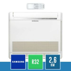 Console a pavimento Samsung AC026RNJDKG/EU da 2.6 kW, gamma Standard Digital Inverter in gas R32, dotata di filtro aria e telecomando wireless che garantisce la doppia mandata dell'aria in riscaldamento.